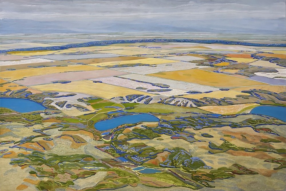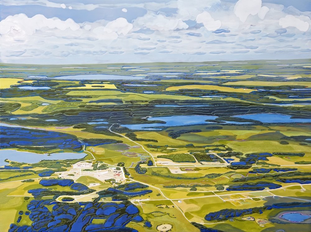 Cline has created a muti-media exhibition incorporating paintings, audio works and video that offer an immersive experience of the land. The initial fieldwork for ‘Viewfinder’ consisted of a series of one-on-one encounters with each project participant in their environment. The goal was to have meaningful exchanges on the land that impacted Cline’s renderings of the landscape. Cline documented these walks through audio recordings, video recordings, and an aerial survey of the sites from viewpoint of a Cessna Skyhawk airplane. Key encounters on the ground were marked through the collection of GPS points that were used to create the flight plans over each location. This has translated into a series of paintings of the landscape that capture some of the shared experience on the land with the project’s key participants. The exhibition also features video documentation of participants walking through the different project sites and an archive of short explanatory videos featuring the activities of project participants on the land.